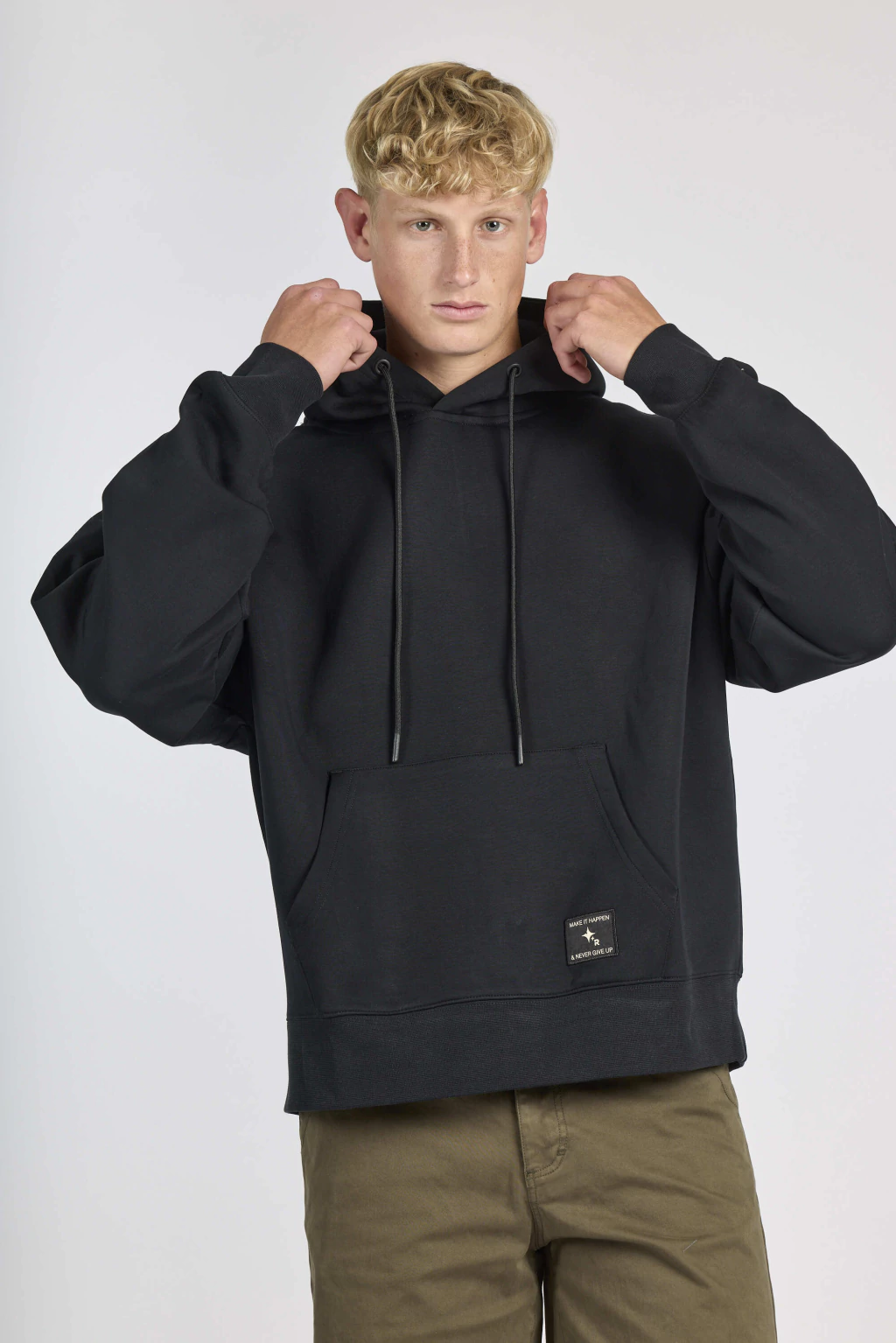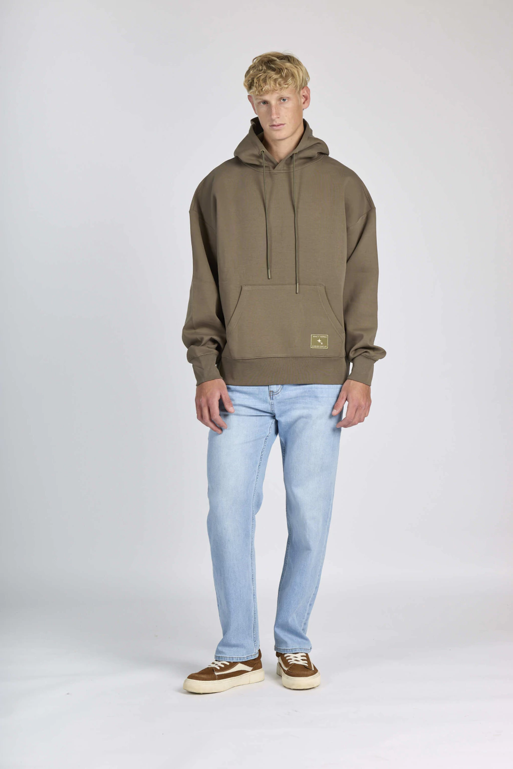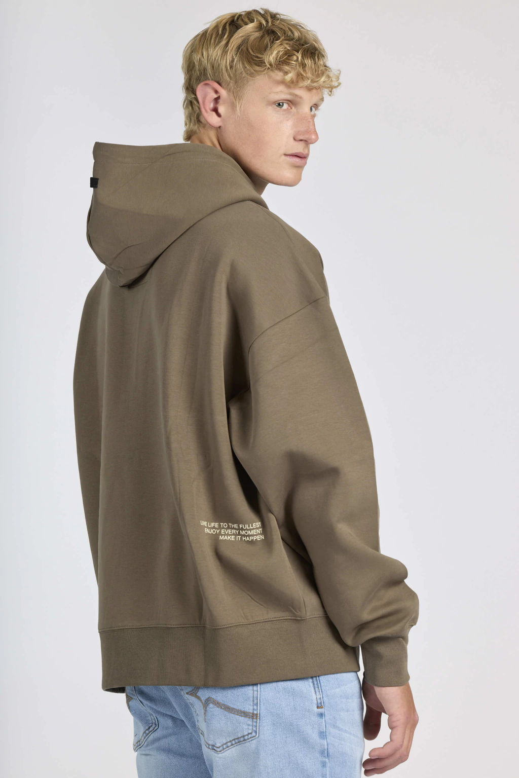 Buzo oversize con bolsillo canguro y capucha con cordón.