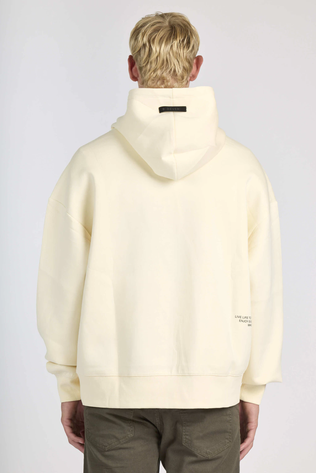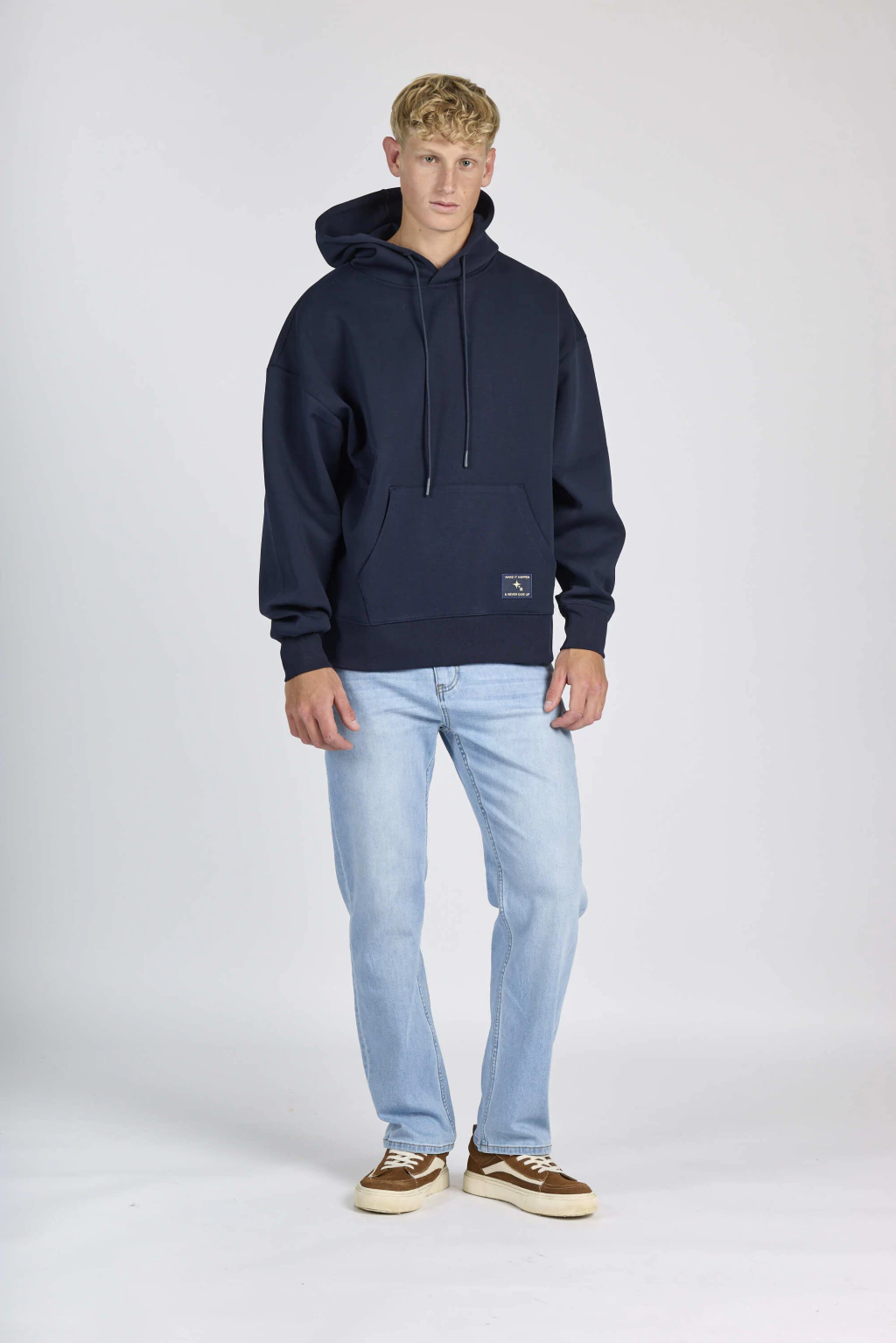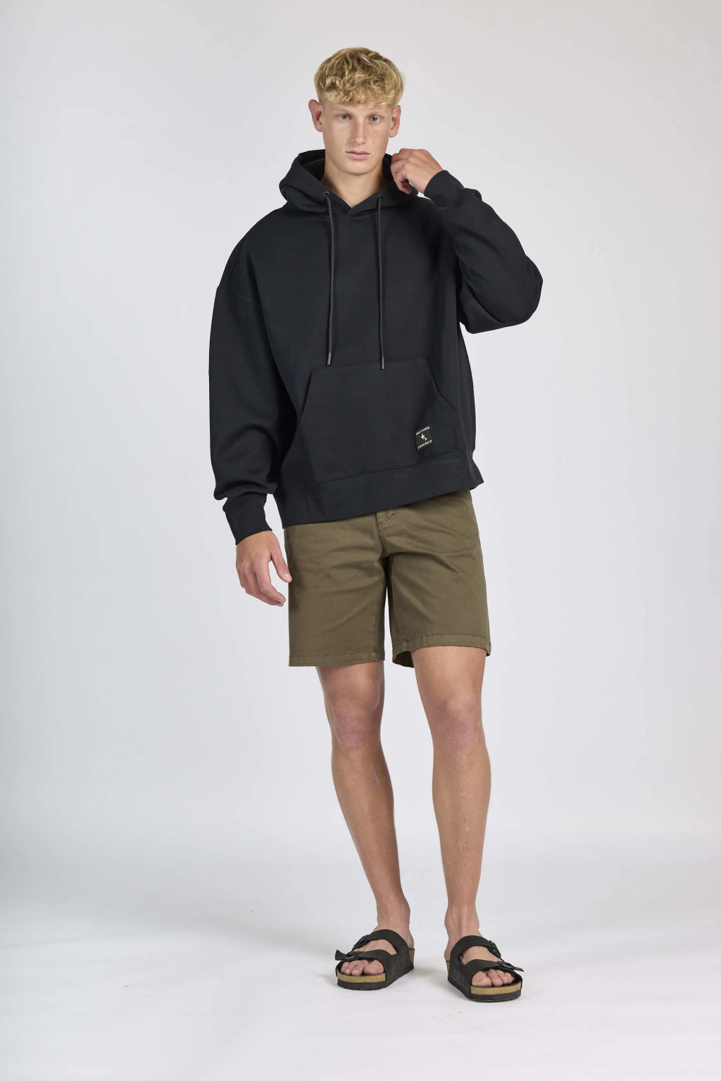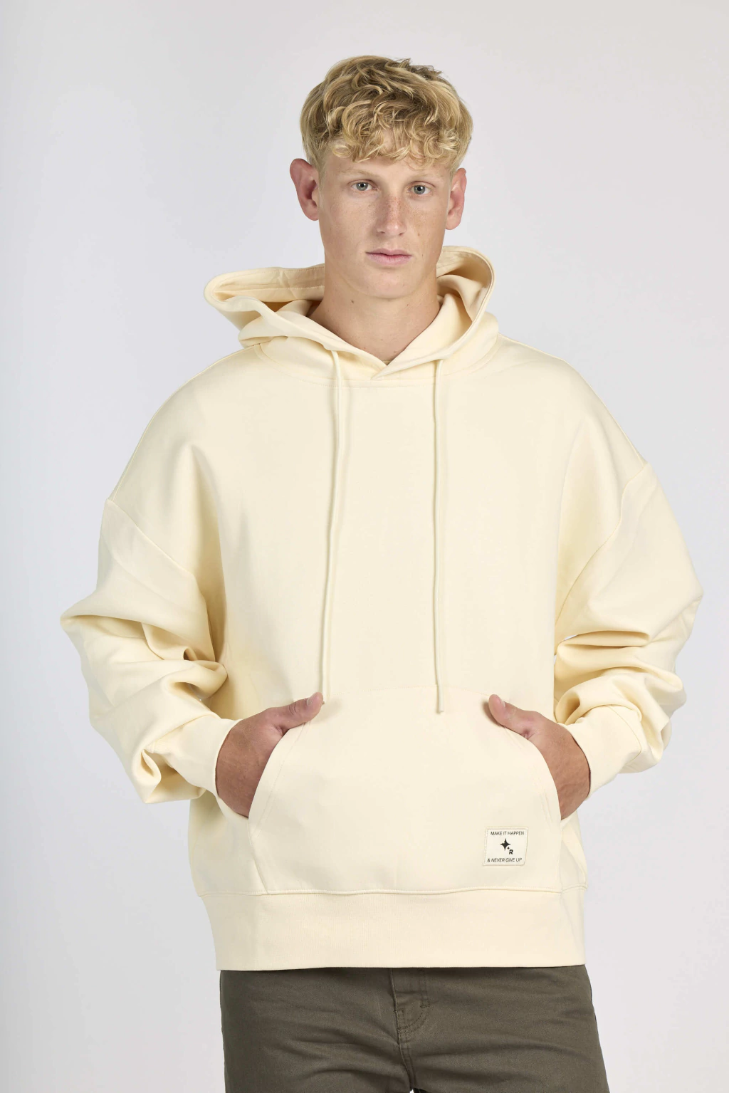 Buzo oversize con bolsillo canguro y capucha con cordón.