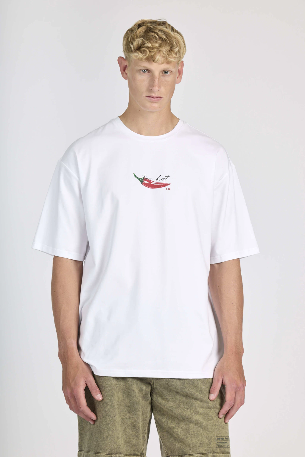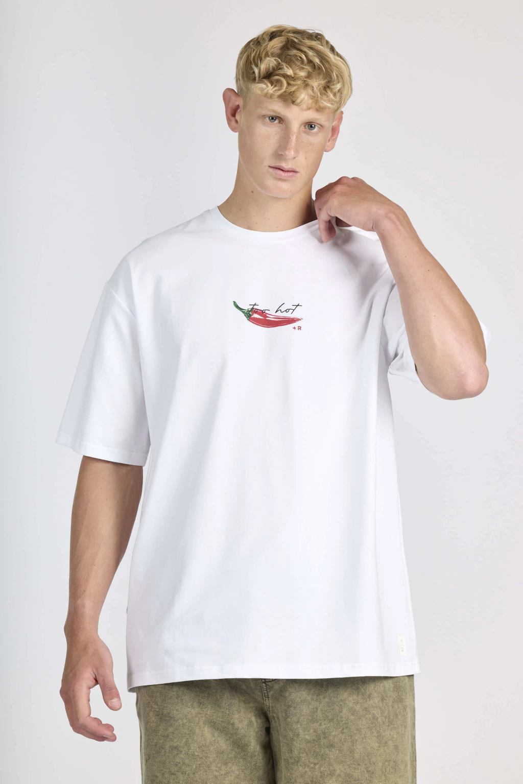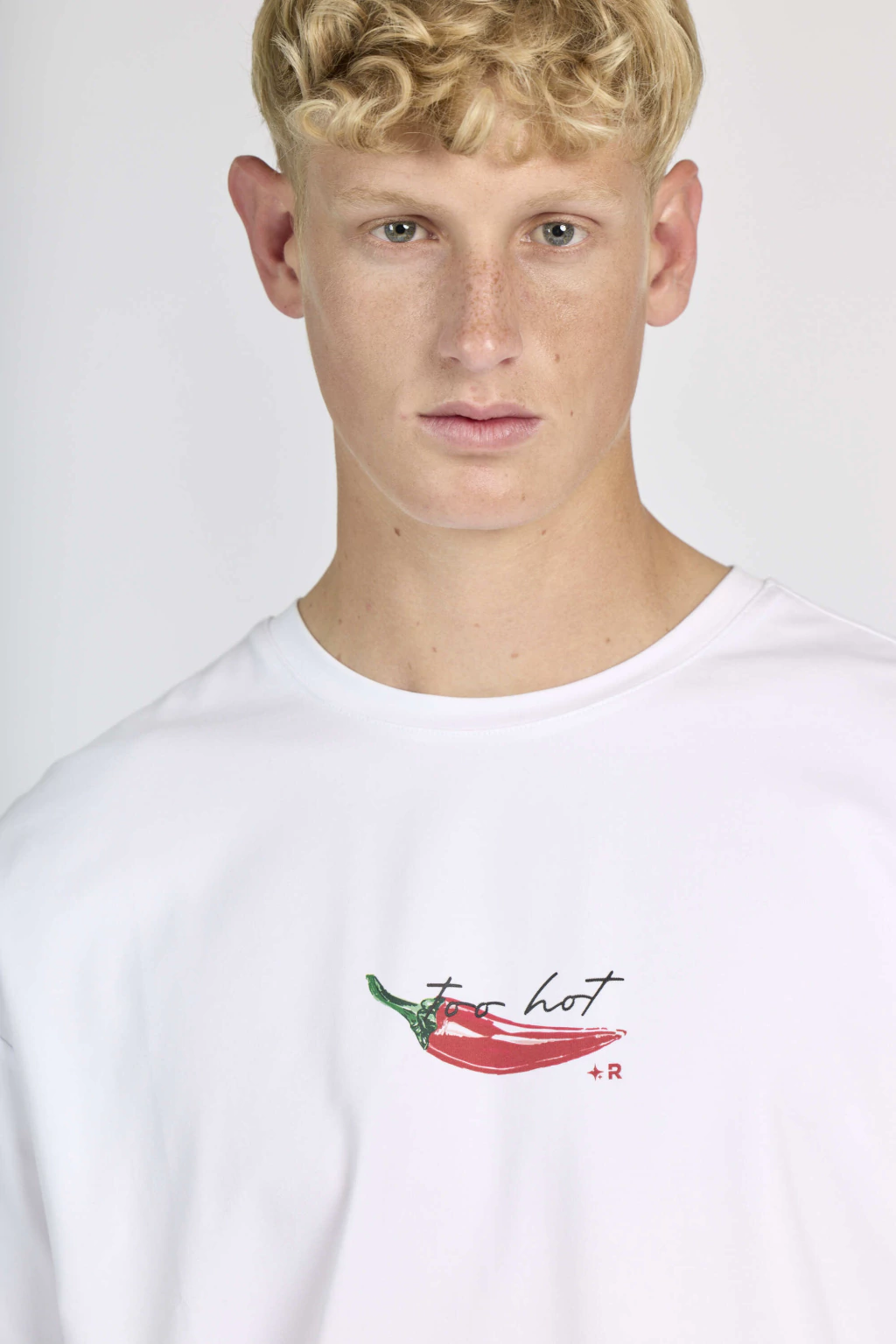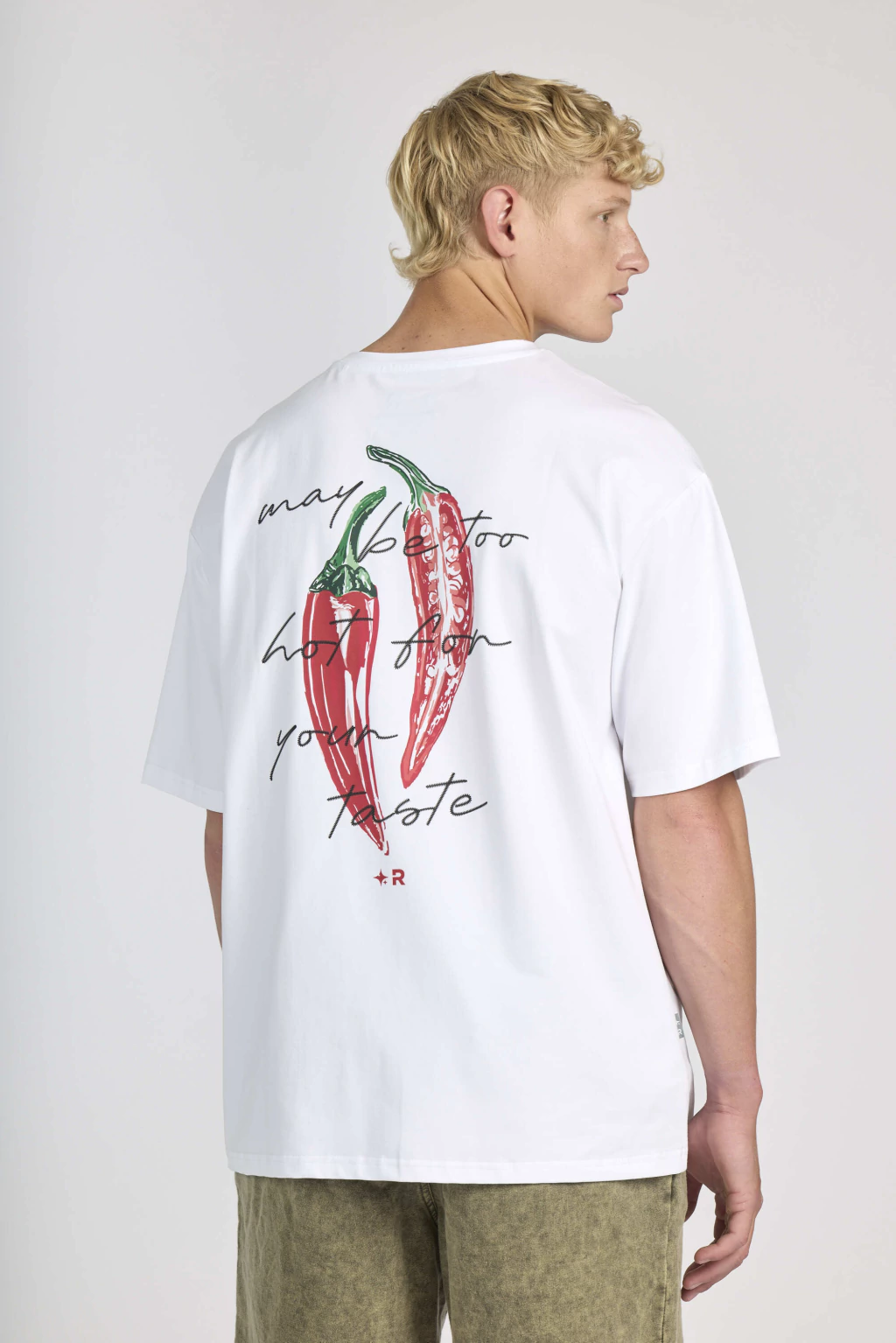 Con un diseño único de chiles vibrantes, aplicada con una técnica de estampado que imita el bordado tradicional en puntada cadena (chain stitch).